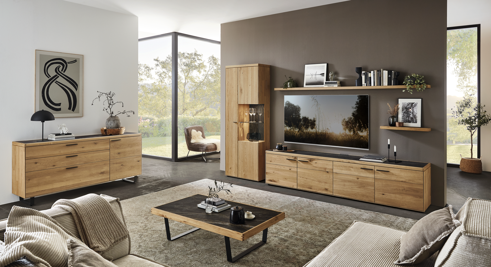 WM 2520 verbindet warme Wildeiche mit eleganter Keramik. Klare Linien, feine Details und viel Stauraum machen dieses Wohnprogramm zum modernen Blickfang.