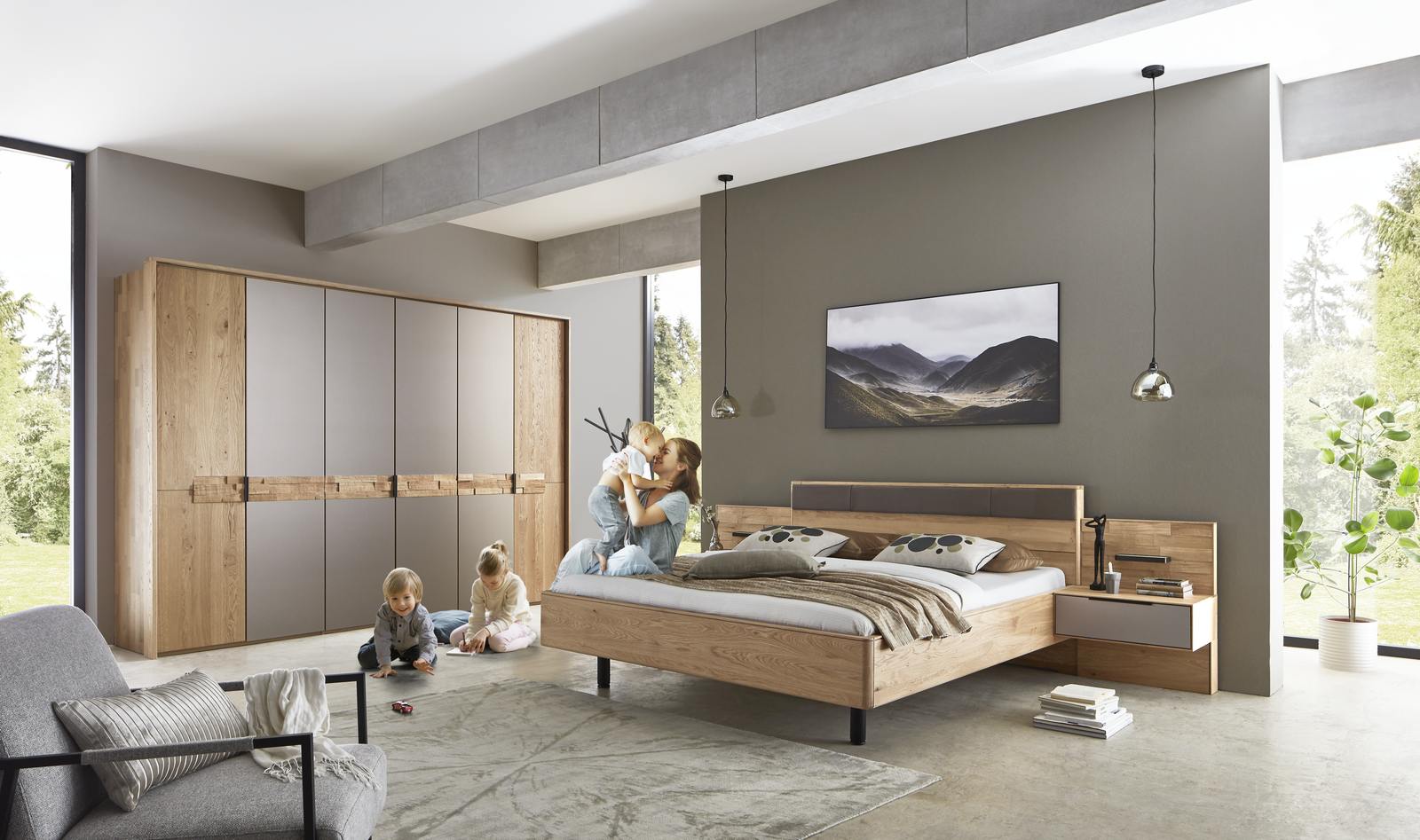 Das Schlafzimmerprogramm WSM 2800 vereint Wildeiche, Spaltholz und Mattglas zu einem harmonischen Design. Komfort und Stauraum inklusive – für deine Ruhezone.